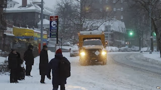 The New York Times said 6in of snow had fallen on Central Park by 07:00 and the temperature was the same as in Fairbanks, Alaska. Friday is forecast to be bitterly cold across much of the region.